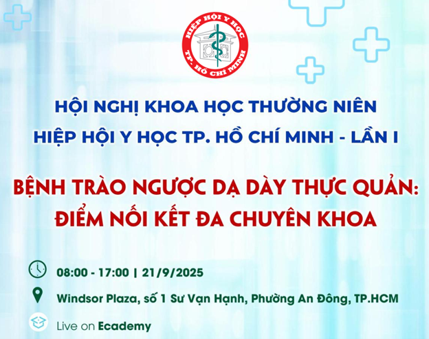 Hội nghị Khoa học Thường niên Hiệp hội Y học TP.HCM – Lần I với chủ đề “Bệnh trào ngược dạ dày thực quản: Điểm nối kết đa chuyên khoa” sẽ diễn ra ngày 21/9/2025 tại Khách sạn Windsor Plaza, TP.HCM, đồng thời phát trực tuyến trên Ecademy. Đây là dịp để các chuyên gia đa chuyên khoa cùng cập nhật kiến thức và chia sẻ kinh nghiệm trong chẩn đoán, điều trị.